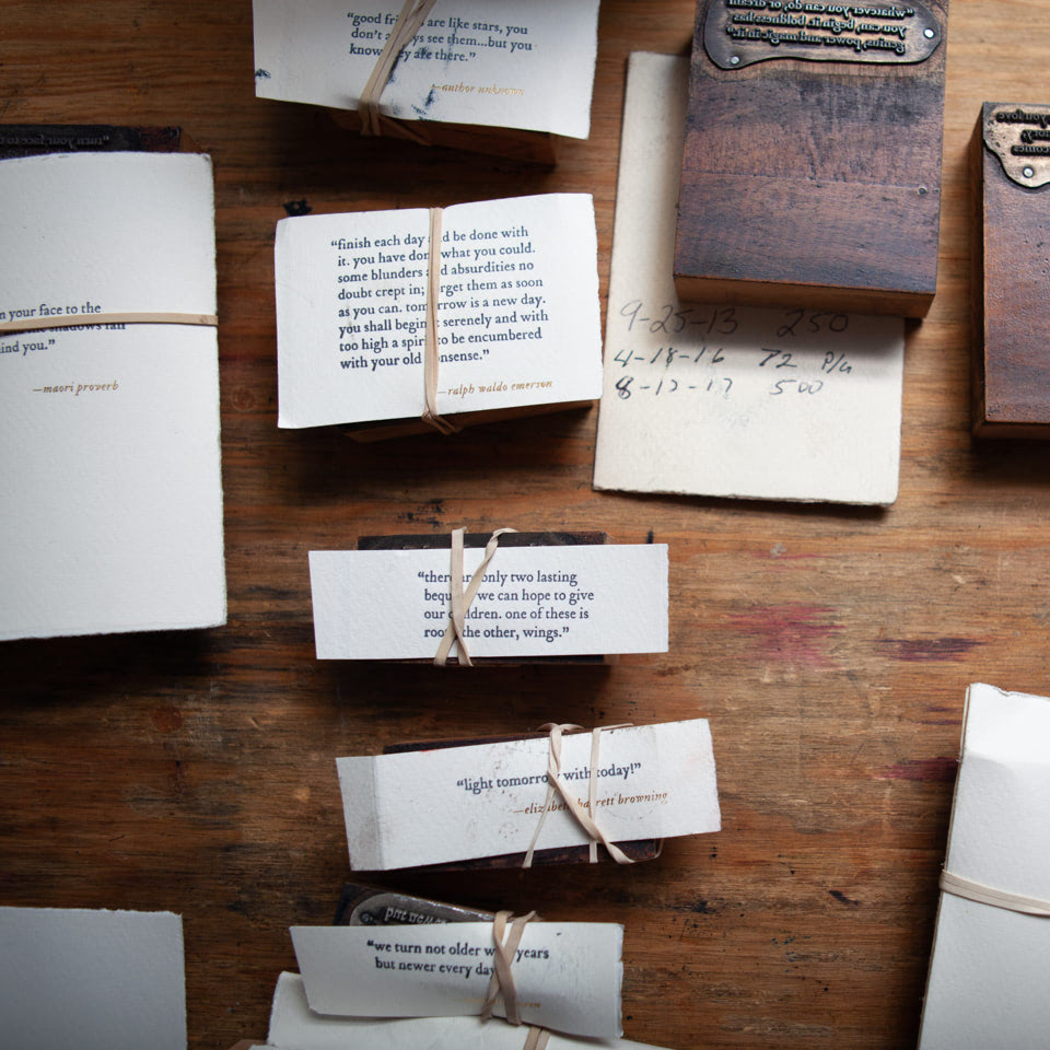 A mindful mix of modern and vintage, Occasionally Speaking cards express care through every aspect, from the thoughtful selection of quotes and clean, sophisticated design to the vintage letterpress printing, earth-friendly soy inks, and 100% cotton paper imported from Fabriano, a papermill operating in Italy since the 13th century. We are a family business, and every card is hand-folded by someone I love, most often my mother.